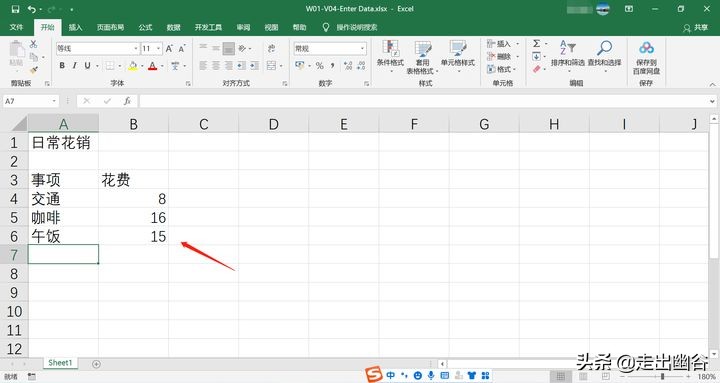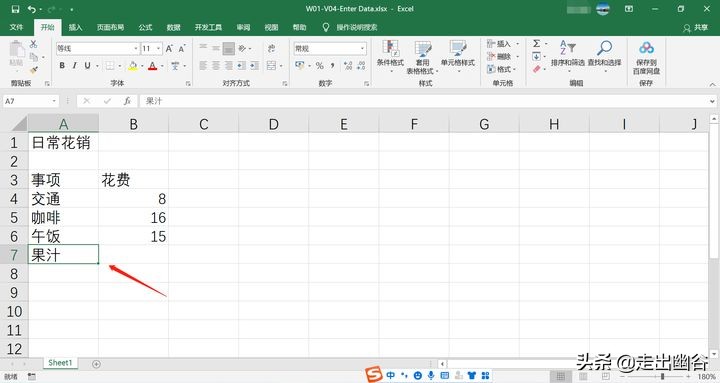 1. 此时活动单元格到A7,那如果不小心在该单元格中输入了一个不是当天的花销事项,如“果汁”;要删除A7单元格中的数据,先选中该单元格,再按Delete键即可。