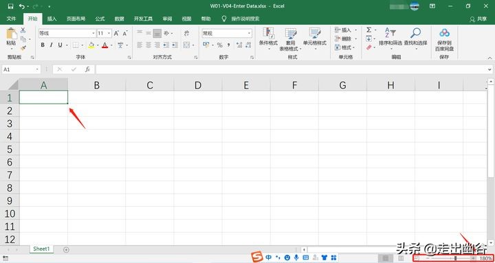 2. 为了让我们在输入数据的时候视觉效果稍好一些,我们可以将工作表的界面调大一些,例如我们放大到180%。