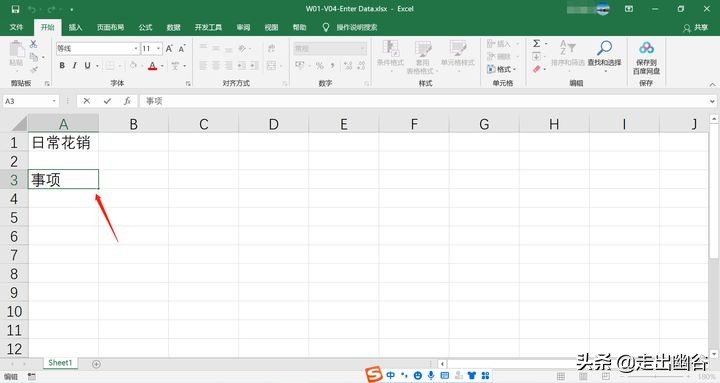4. 再次按下Enter键,会跳到A3单元格,然后在A3单元格中输入“事项”。