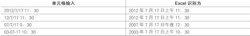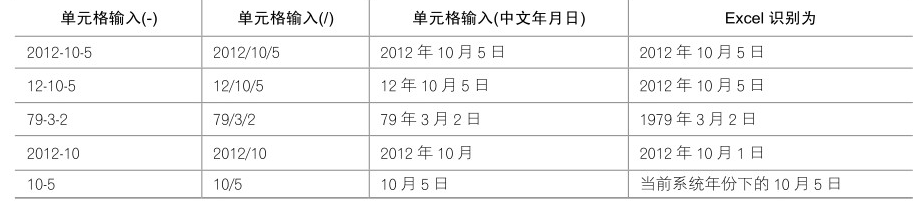 在默认的中文 Windows 操作系统下,使用短杠(-)、斜杠(/)和中文“年月日”间隔等格式为有 效的日期格式(如“2013-1-1”是有效的日期),都能被Excel识别,具体如表所示。