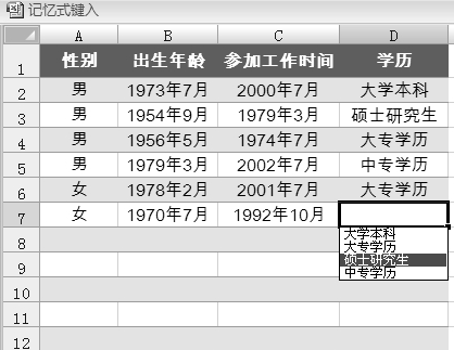 在输入过程中,Excel会智能地记忆之前输入过的内容,当用户再次输入的起始字符与该列的录入项相符时,Excel会自动填写其余字符,且呈黑色选中状态,按<Enter>键即可完成输入。如果不想采用自动提供的字符,可继续输入。如果要删除自动提供的字符,按<Backspace>键即可。