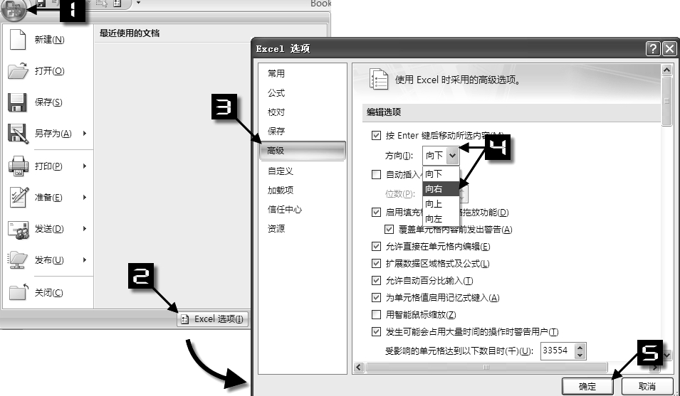 依次单击【Office按钮】→【Excel选项】,在打开的【Excel选项】对话框的【高级】选项卡的【编辑选项】区域,在确保【按Enter键后移动所选内容】复选框勾选前提下,单击【方向】右侧的下拉按钮,在弹出的选项中单击需要的方向,如【向右】,最后单击【确定】按钮关闭对话框完成操作,如图所示。
