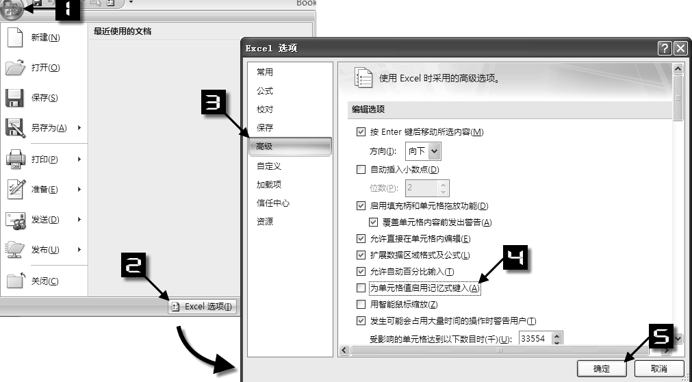 如果用户觉得“记忆式键入”功能分散了注意力,也可以关闭它。依次单击【Office按钮】→【Excel选项】,打开【Excel选项】对话框,在【高级】选项卡的【编辑选项】区域中取消勾选【为单元格值启用记忆式键入】复选框,最后单击【确定】按钮,如图所示。