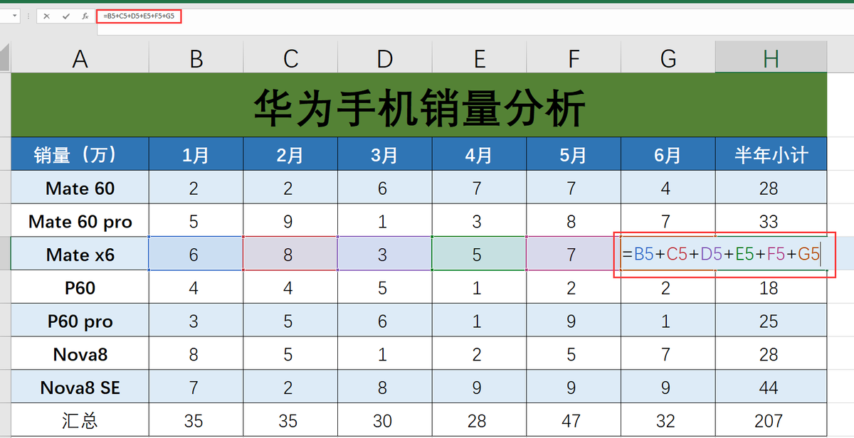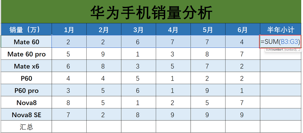 操作方法2:在目标单元格直接手动输入=SUM(B3:G3)进行求和。