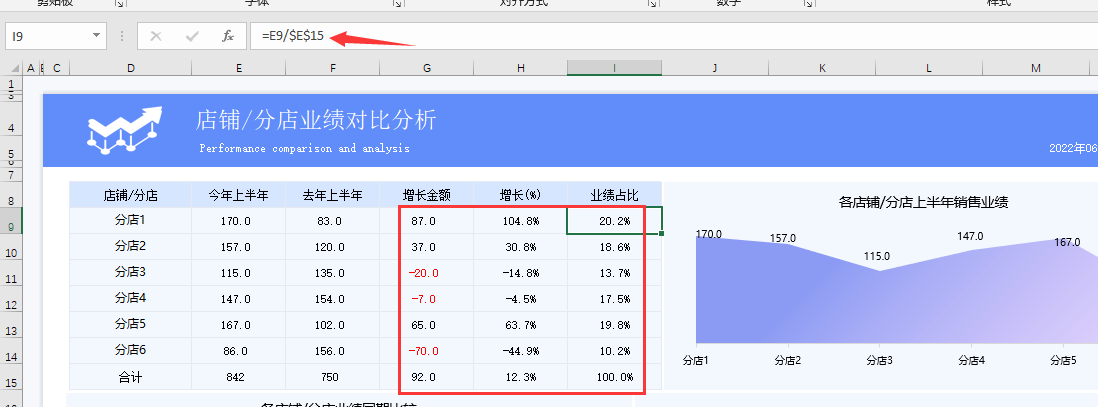 メ左上角为数据源区域,增加金额,增加率,业绩占比,函数公式自动计算,无需手动录入。メ