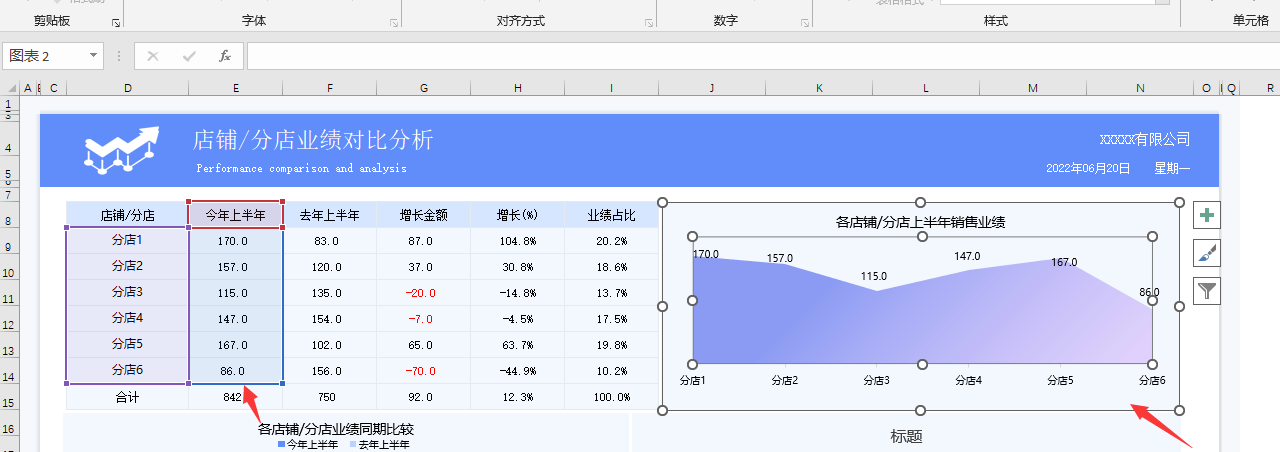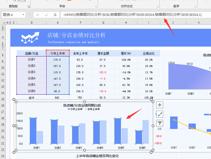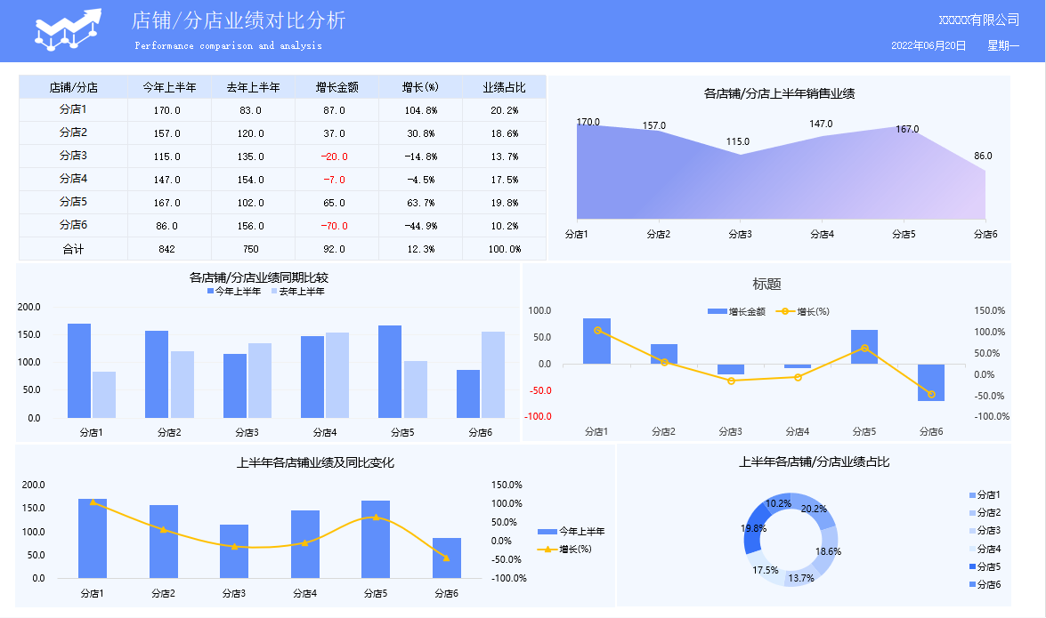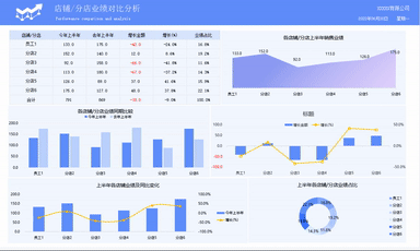 メ大家请看范例图片,Excel分店业绩对比分析表,多图表动态展示,模板表格直接套用。メ