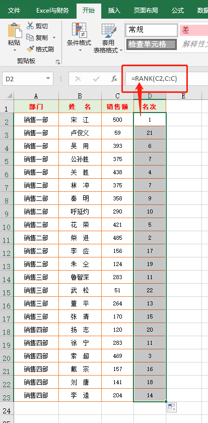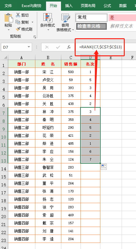 第三步:……其他部门以此类推,RANK函数的第二个参数就是各部门对应的销售业绩,最后记得加上$符号。