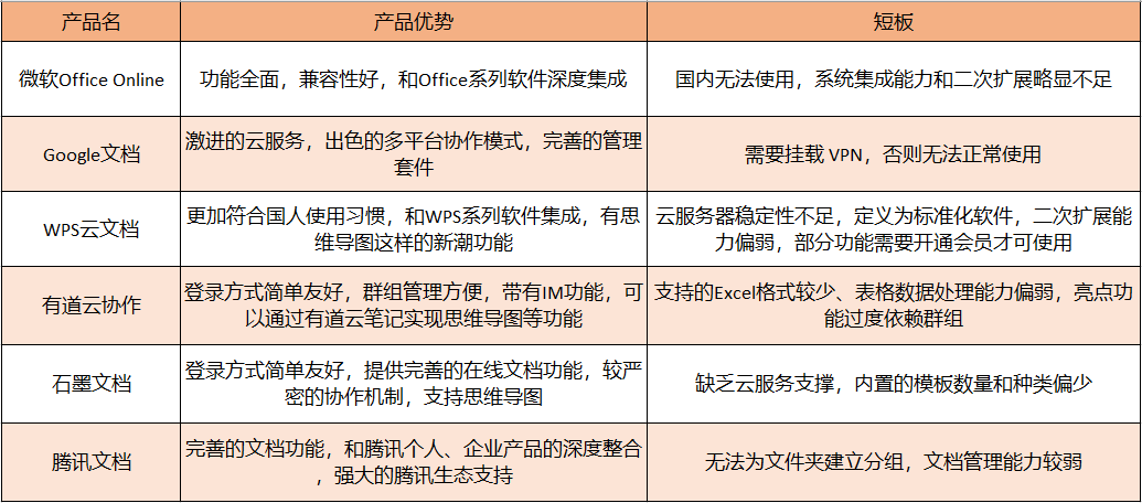 那么,市场对协同办公产品的核心需求到底是什么?我们对市面上的产品做了一个优劣势对比: