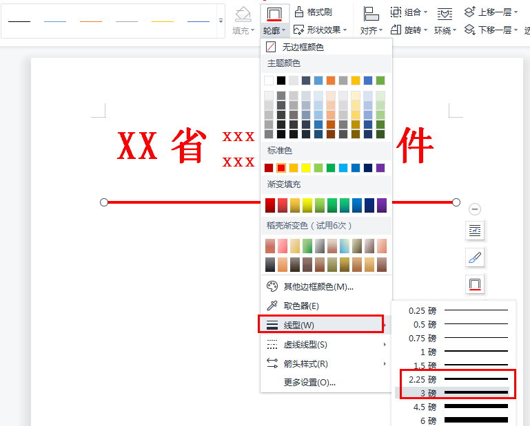 四、选中刚才画的横线,点击【轮廓】中设置颜色为红色,【线型】中可以设置宽度,(这里设置的是【3磅】)