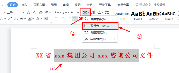 一、首先输入标题,然后选中需要合并的文本,点击【开始】——【中文版式】——【双行合一】(这里的主标题和副标题字数一致,如果遇到字数不一样的可以用空格来调整)