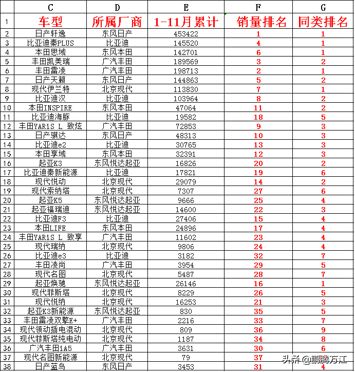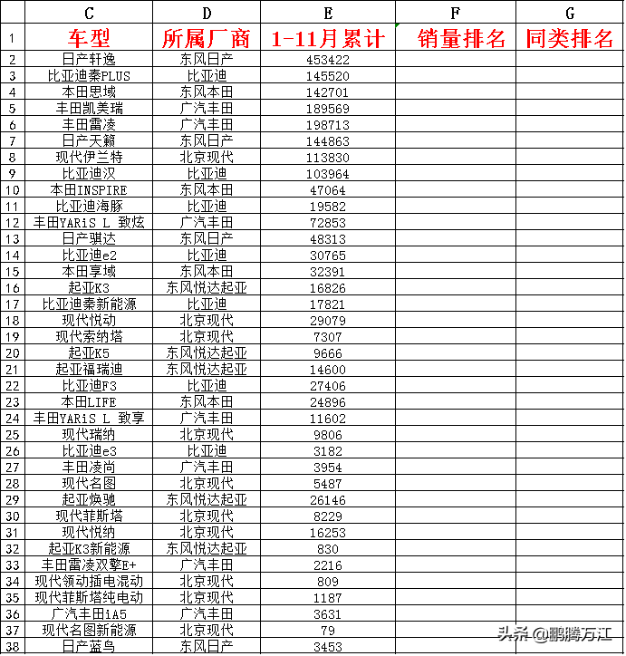 1、给所有车型按销量从大到小进行排序,并标上对应的序号。填写在F列。