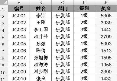 图是某公司的奖金分配表,其中E列是主管领导根据员工的级别和考核得分确定的奖金金额。为了防止领导误填入文本数据导致后续计算错误,可以使用数据有效性限制E2:E11单元格区域只能输入数字,方法如下。