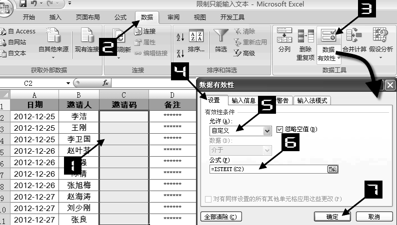 “ISTEXT(C2)”用于判断单元格内容是否为文本,如符合返回TRUE,允许输入;否则返回FALSE,限制输入。