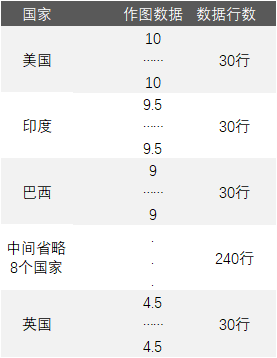 填充作图数据时,把每个国家的数值填充占比30行,由于数据行数较多,不方便截图展示,利用下图说明。