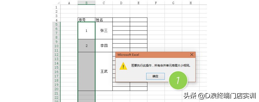 例如下列表格,需要在B列的序号里面以此添加1,2,3序号,如果直接用拖拽的方法,Excel会出现下面的提示,如下图1处。当然你可能会说:”这个不需要拖拽吧,直接输入1,2,3不就好了”。这个….当然是假设合并单元格比较多的时候,如何能够批量的完成?