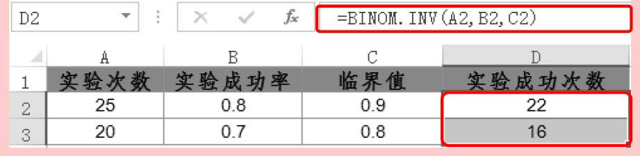 分别根据实验次数“25”、临界值“0.9”,以及实验成功的概率“0.8”,返回累积二项式分布大于等于临界值的最小值。