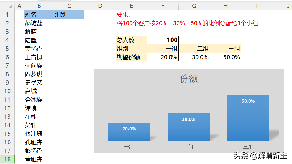 小王:老板给了我一份100人的客户名单,叫我按照20%、30%、50%的概率分配给公司的三个三组。