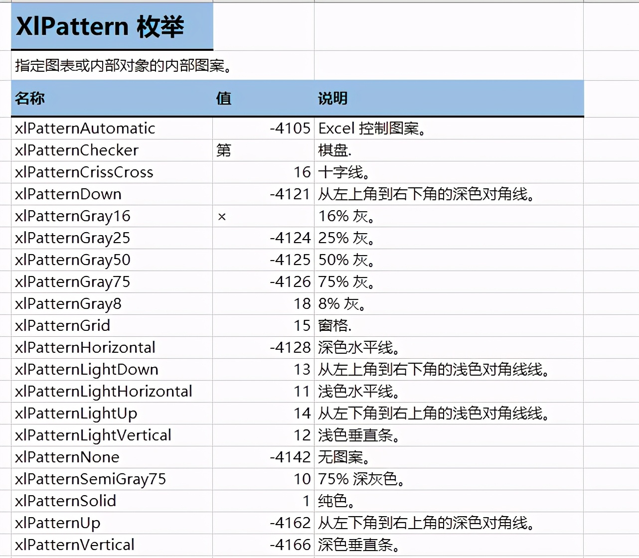 仔细看代码就会明白,一个表格内部设置用到Interior对象,然后设置线性渐变用到Pattern属性,这个是必需选择常量xlPatternLinearGradient,如果选择其它就不是线性渐变,后面的代码就是报错。