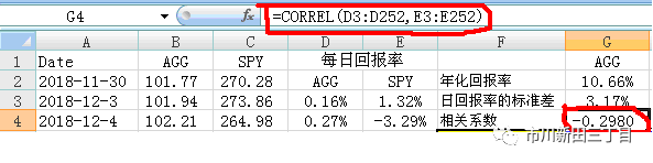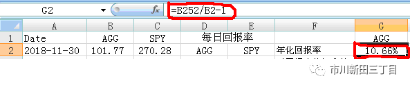 第二步 计算AGG和SPY的每日回报率,回报率计算公式为LN(最新的收盘价/前一个交易日的收盘价),也可以用比较传统的方法,即(最新的收盘价/前一个交易日的收盘价)-1,在计算每天的回报率时这两种方法的结果差异很小