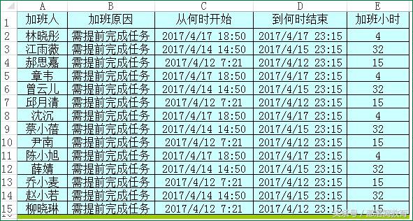 下面的Excel数据源截图,是后台一个小伙伴给小雅的留言,询问该如何写加班小时计算公式。