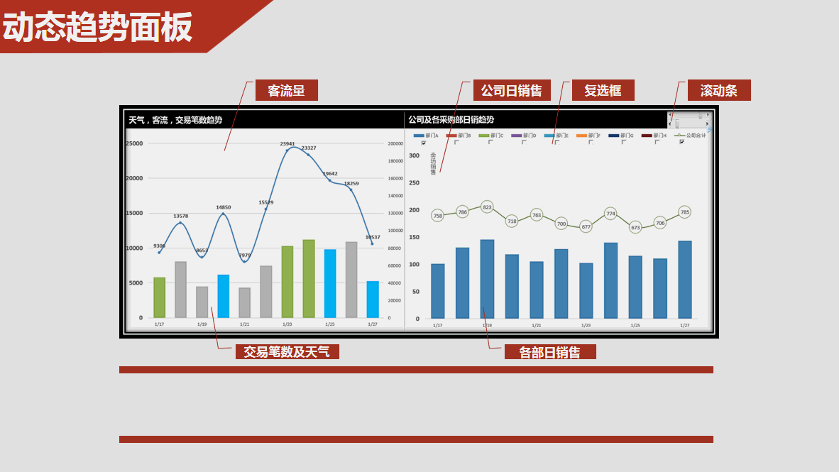 右边:绿色折线图代表公司总销售,下面的柱形代表特定部门的销售。纵坐标代表销售金额,以万元为单位,横坐标为日期