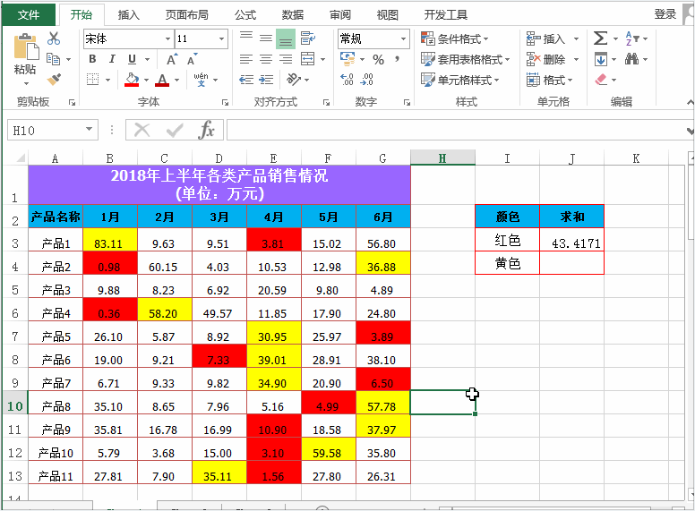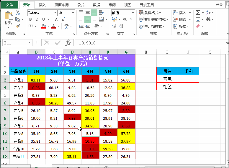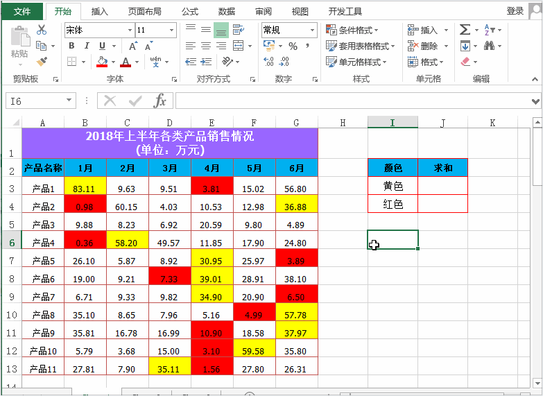 例如,以下表格,想要分别对表格中背景色填充颜色为红色和黄色的单元格求和。