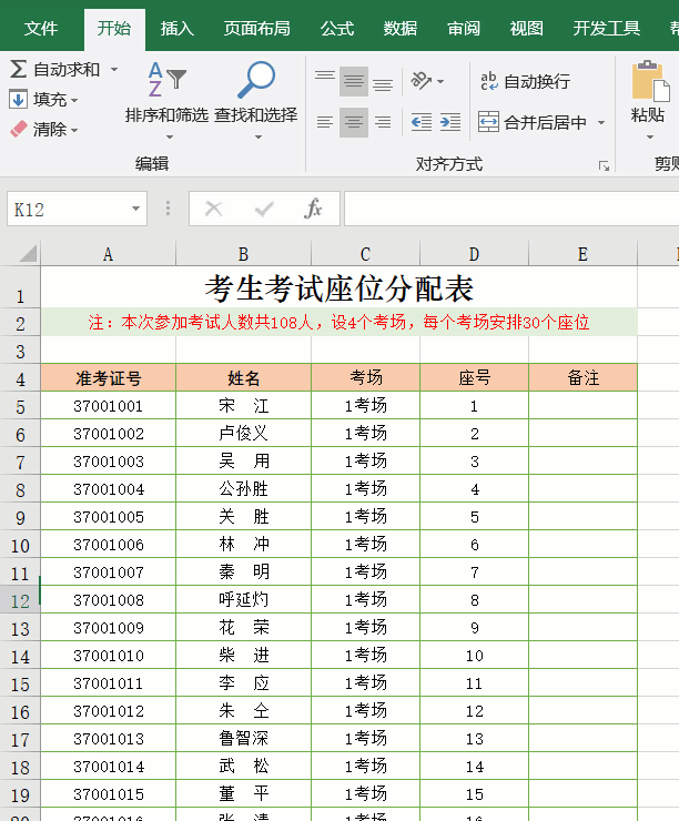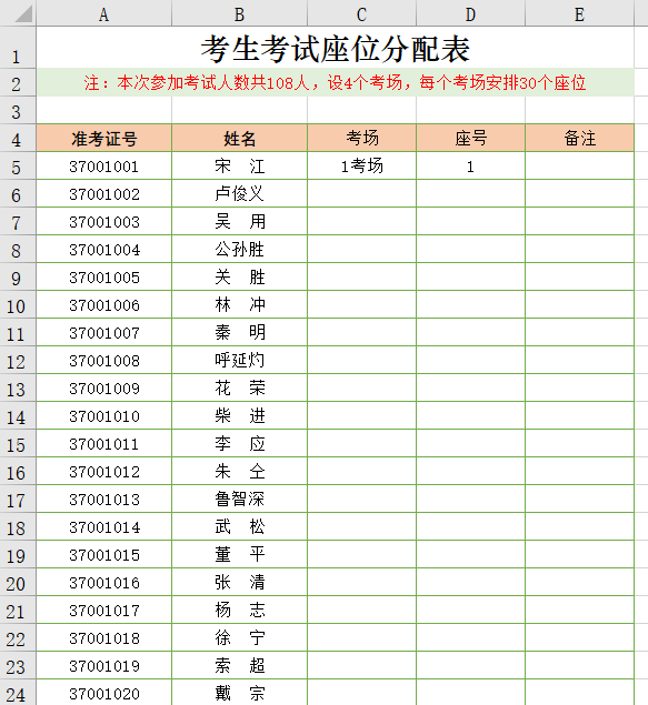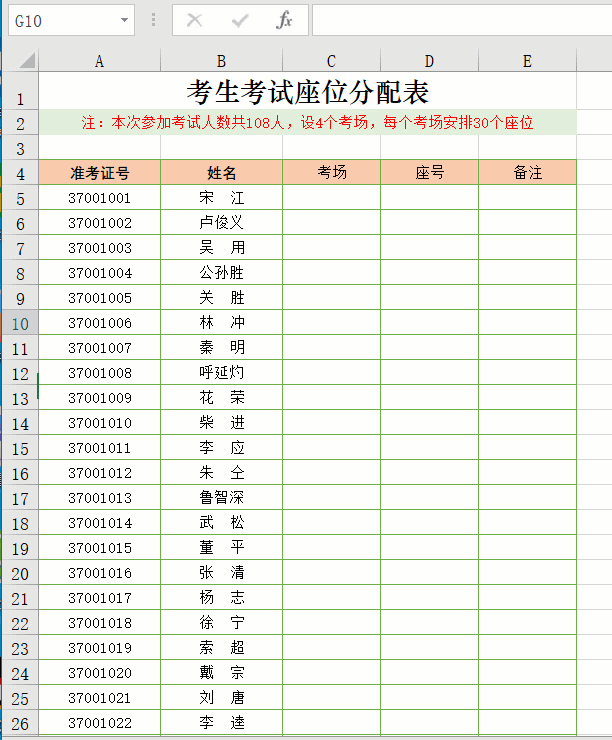 学校中,学生学习一段时间要进行考试;工作中,员工岗位技能考试也是必不可少的。既然要考试,就要涉及到考生座位的安排,人数少手工安排也能完成,要是人数多,可就麻烦喽。今天我们以下图为例一起来学习快速完成考生座位分配。