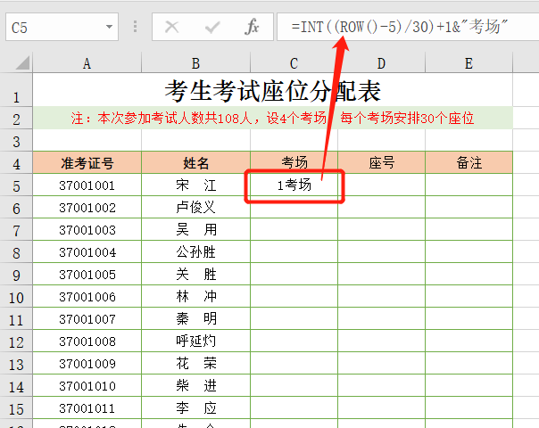 1、在C5单元格输入公式:=INT((ROW()-5)/30)+1&"考场" ,分配第一个考生的考场;公式中ROW()为行号,第一个考生在第5行,所以-5,除以30代表每个考场30名考生,用INT函数取计算结果的整数部分后加1,再用&符号连接文本字符,就得到第一个考生考场;如下图:
