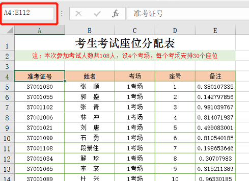 【操作小技巧】选中A4:E112单元格区域,可以在编辑栏地址框里直接输入单元格地址,完成后按回车键即可选中所要的单元格区域,如下图:
