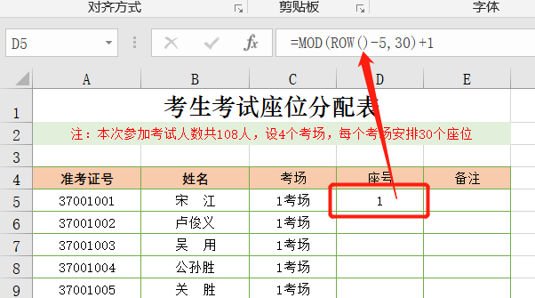 3、在D5单元格输入公式:=MOD(ROW()-5,30)+1 ,计算出第一个考生的座位号。MOD函数是取余数,也就是ROW()-5除以30的余数,再加1就是第一个考生的座位号,如下图: