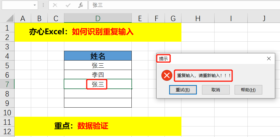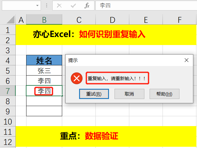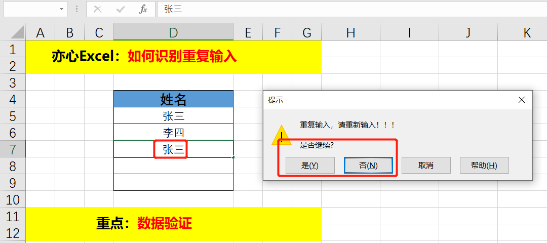 可能有人也注意到了,「出错警告」中的样式选择除了停止,还有警告和信息。信息就是一个提示信息,其实也起到了提示重复的作用,而警告会给出一个是否重新输入的选项。