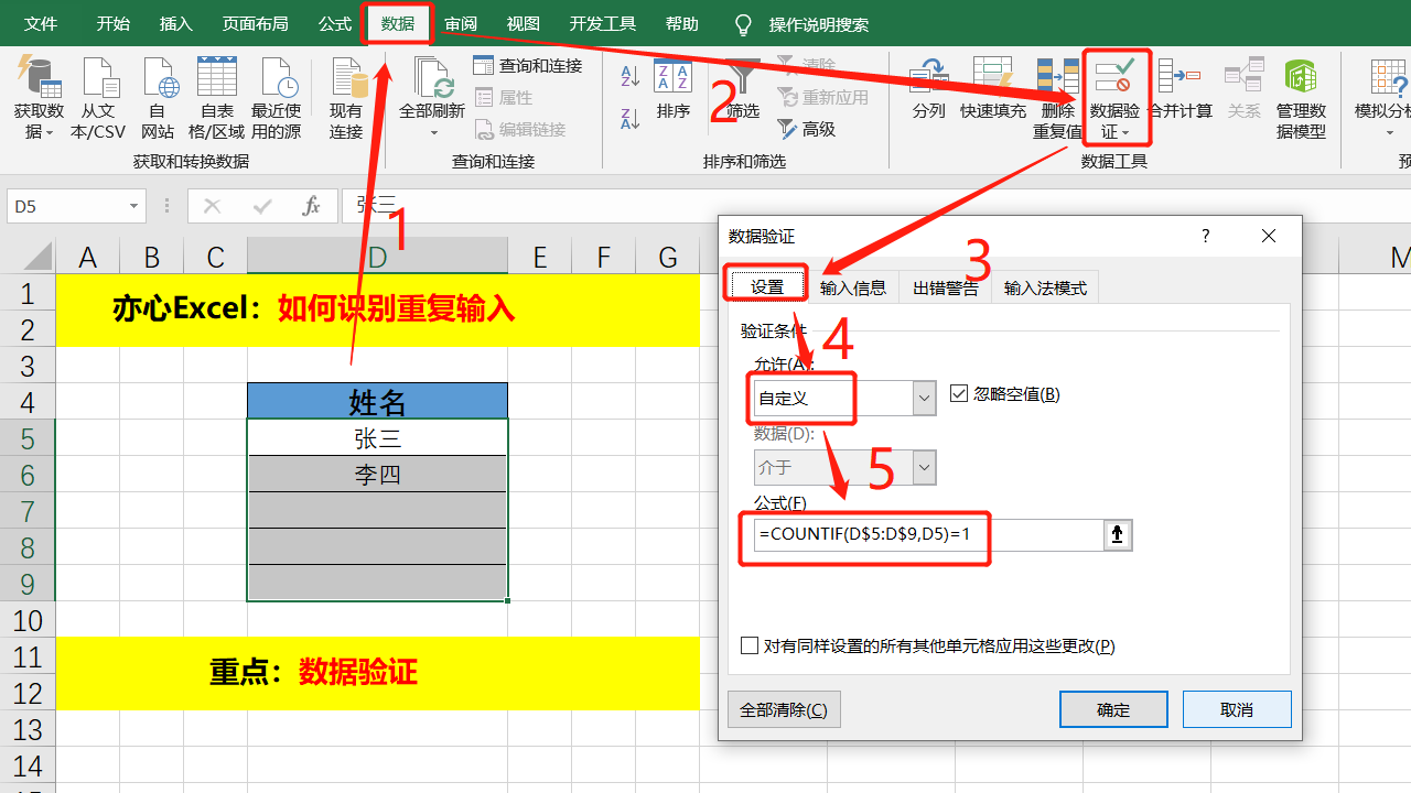 首先选中要验证的数据区域,然后点击「数据验证」,调出数据验证对话框。在「设置」选项卡下,验证条件选择允许「自定义」,并在公式中输入「=COUNTIF(D$5:D$9,D5)=1」;