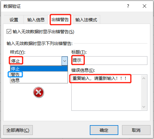 在「出错警告」中我们可以选择样式「停止」,标题和错误信息都可以根据自己要求定义,这里标题:「提示」,错误信息:「重复输入,请重新输入!!!」。