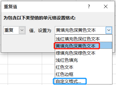 调出重复值对话框以后,我们这里设置「黄填充色深黄色文本」。