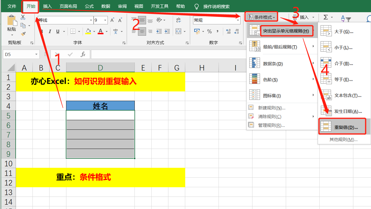 首先选中需要提示重复输入的单元格区域,然后点击「开始」选项卡下「样式」命令组下的「条件格式」,选择「突出显示单元格规则」下的「重复值」。