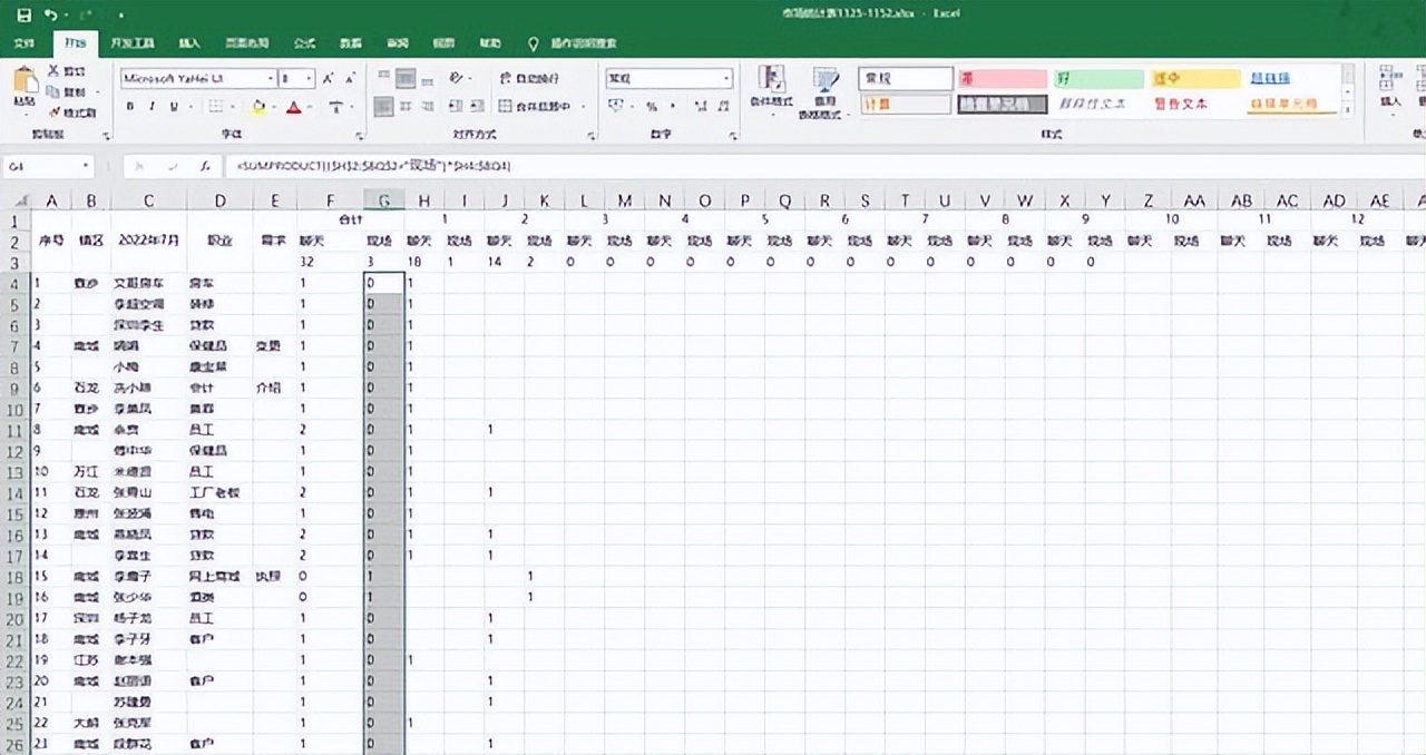 2、因为表页太大,截图没有显示完整的表页,7月份有31天,每天两列的话,最后一天定在BQ列,采用SUMPRODUCT来处理这个求和的问题: