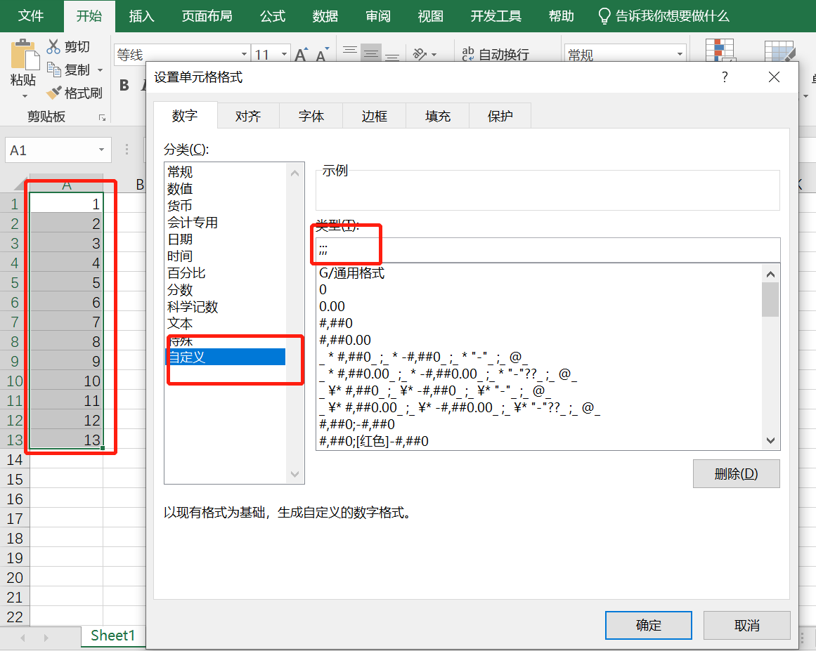 选中Excel中的内容,右键选择设置单元格格式,选择自定义,在类型中输入三个分号:;;;,注意,是三个英文字符的分号哦