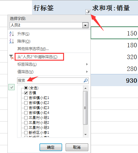 我们再来处理第二个数据组,点开筛选菜单,点击从人员2中清除筛选。