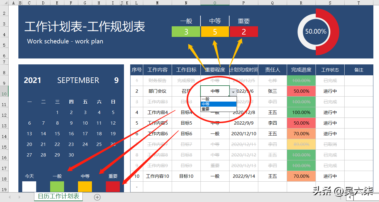 通过这套表格,大家把事情按照重要程度分为三个层次:“一般”、“中等”、“重要”,通过不同的颜色对应不同的重要程度,而且可以实现自动汇总统计,可以量化明确事情的完成情况。