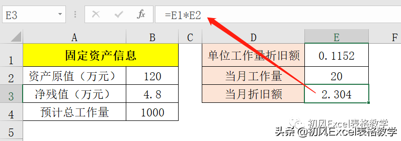 在E3单元格输入公式:=E1*E2。公式返回结果就是当月计算的折旧额。