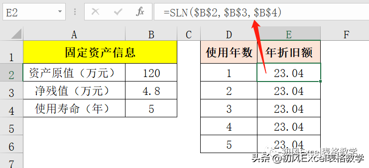 在E2单元格输入公式:=SLN($B$2,$B$3,$B$4)