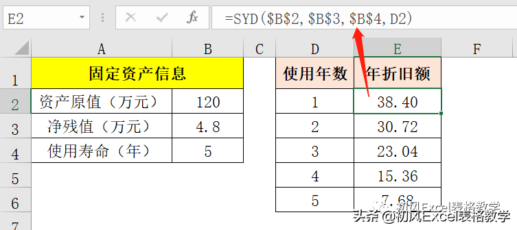 在E2单元格输入公式:=SYD($B$2,$B$3,$B$4,D2)