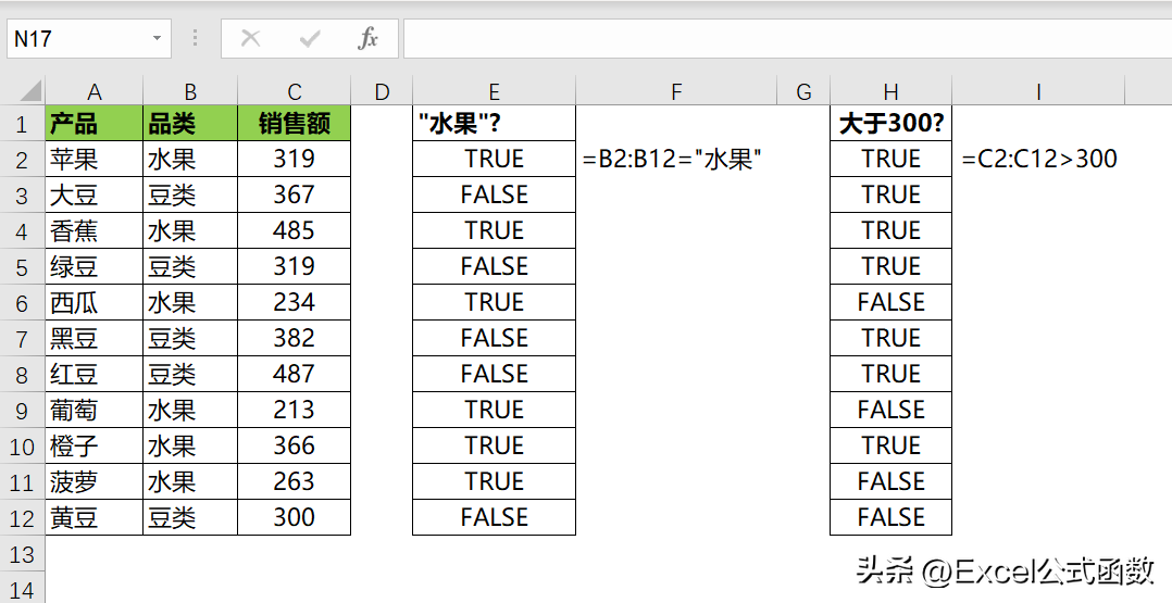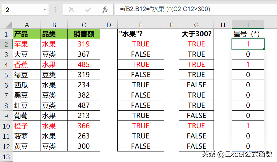 =(B2:B12="水果")*(C2:C12>300)