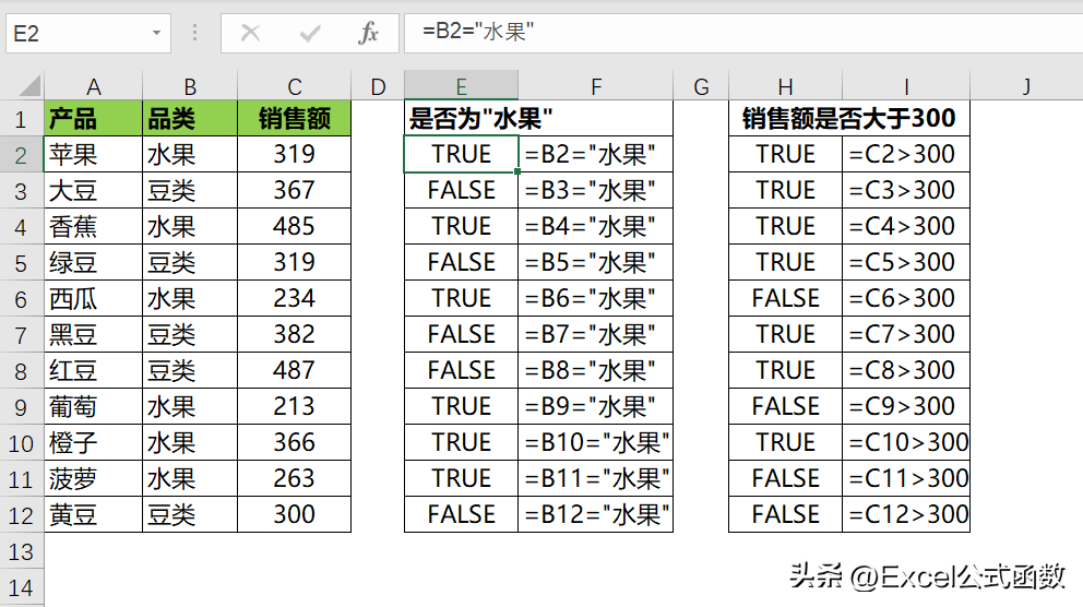 判断是否大于300,如是,则返回TRUE,不是则返回FALSE.