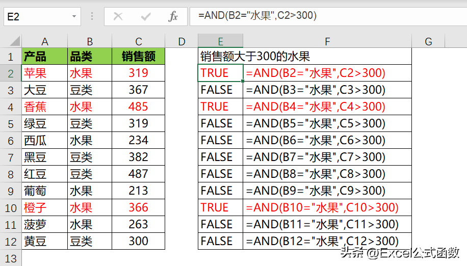 判断是否为水果且销售额大于300,两个条件需同时满足,用AND.