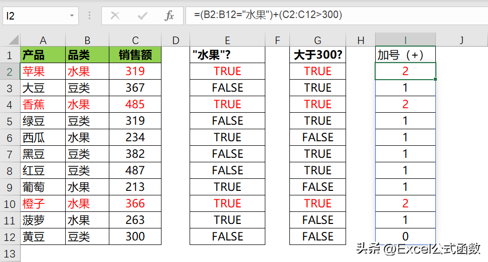 =(B2:B12="水果")+(C2:C12>300)
