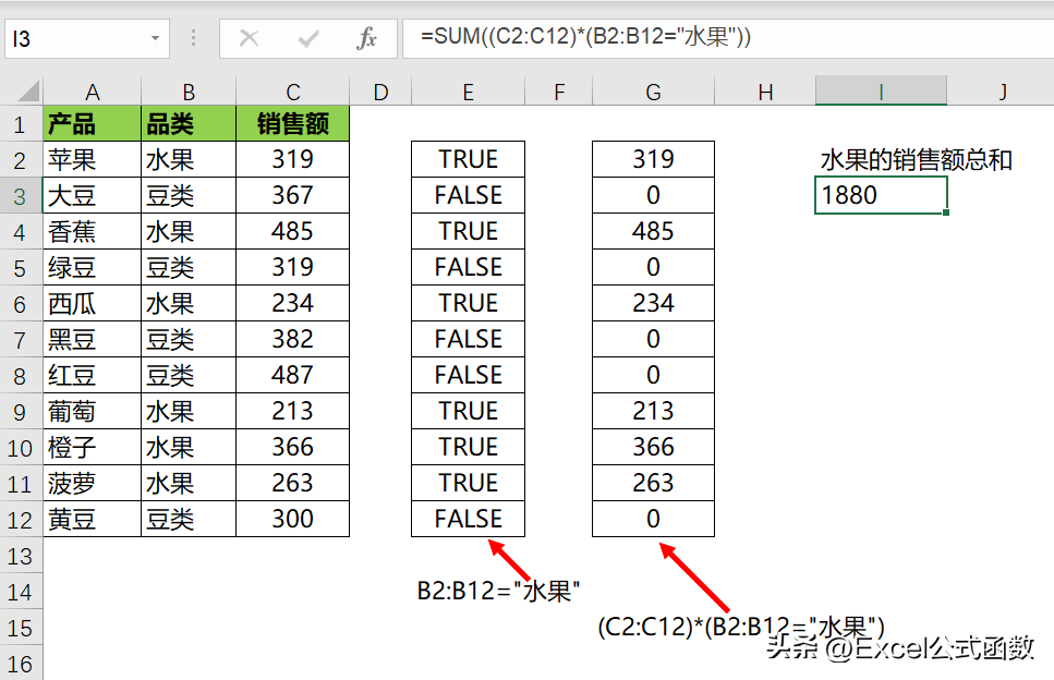 =SUM((C2:C12)*(B2:B12="水果"))