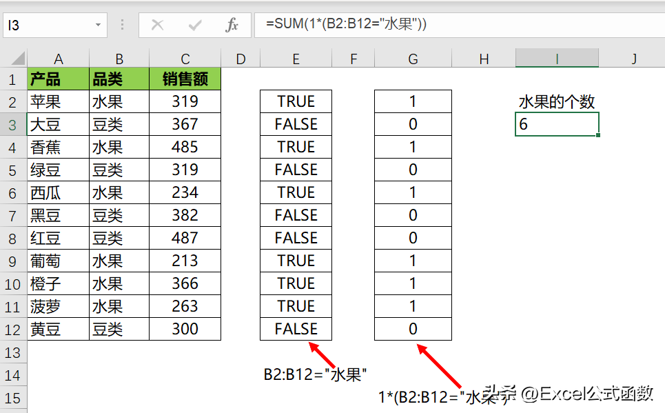 =SUM(1*(B2:B12="水果"))