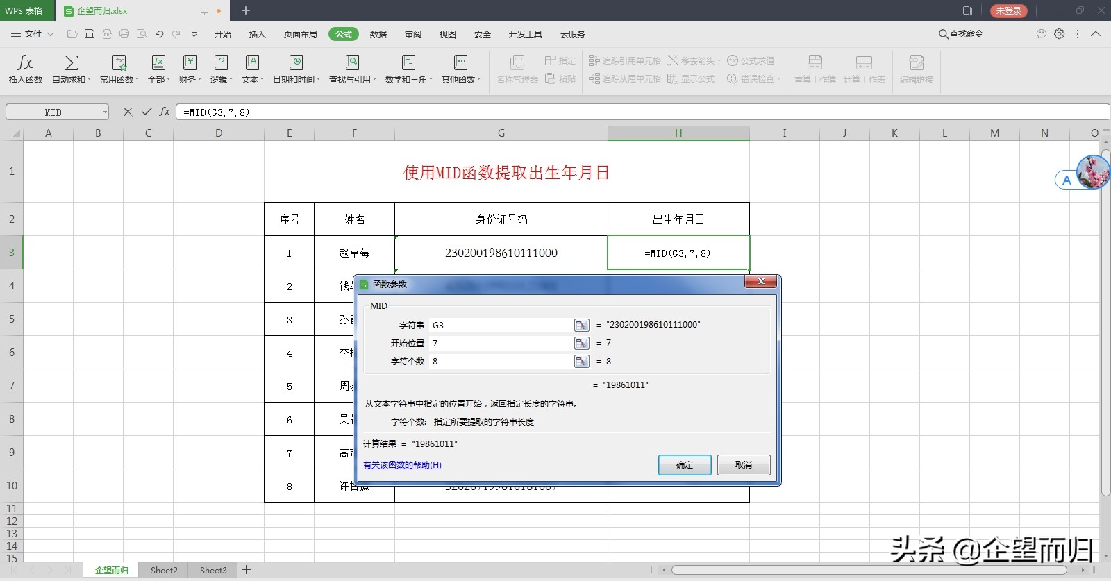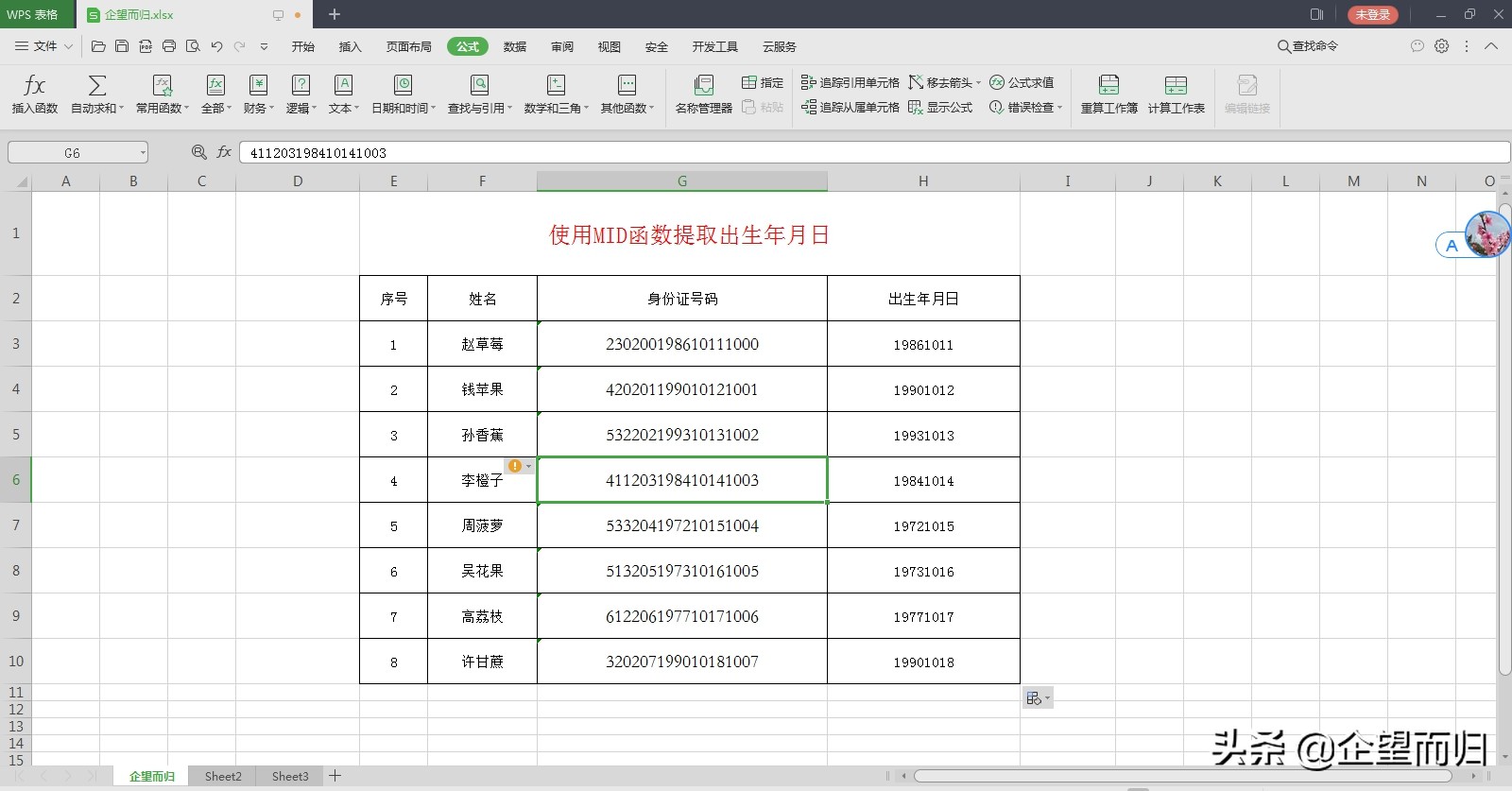 打开的表格中,有一列是身份证号码,我们要从身份证号码中提取出生年月日,选择H3单元格