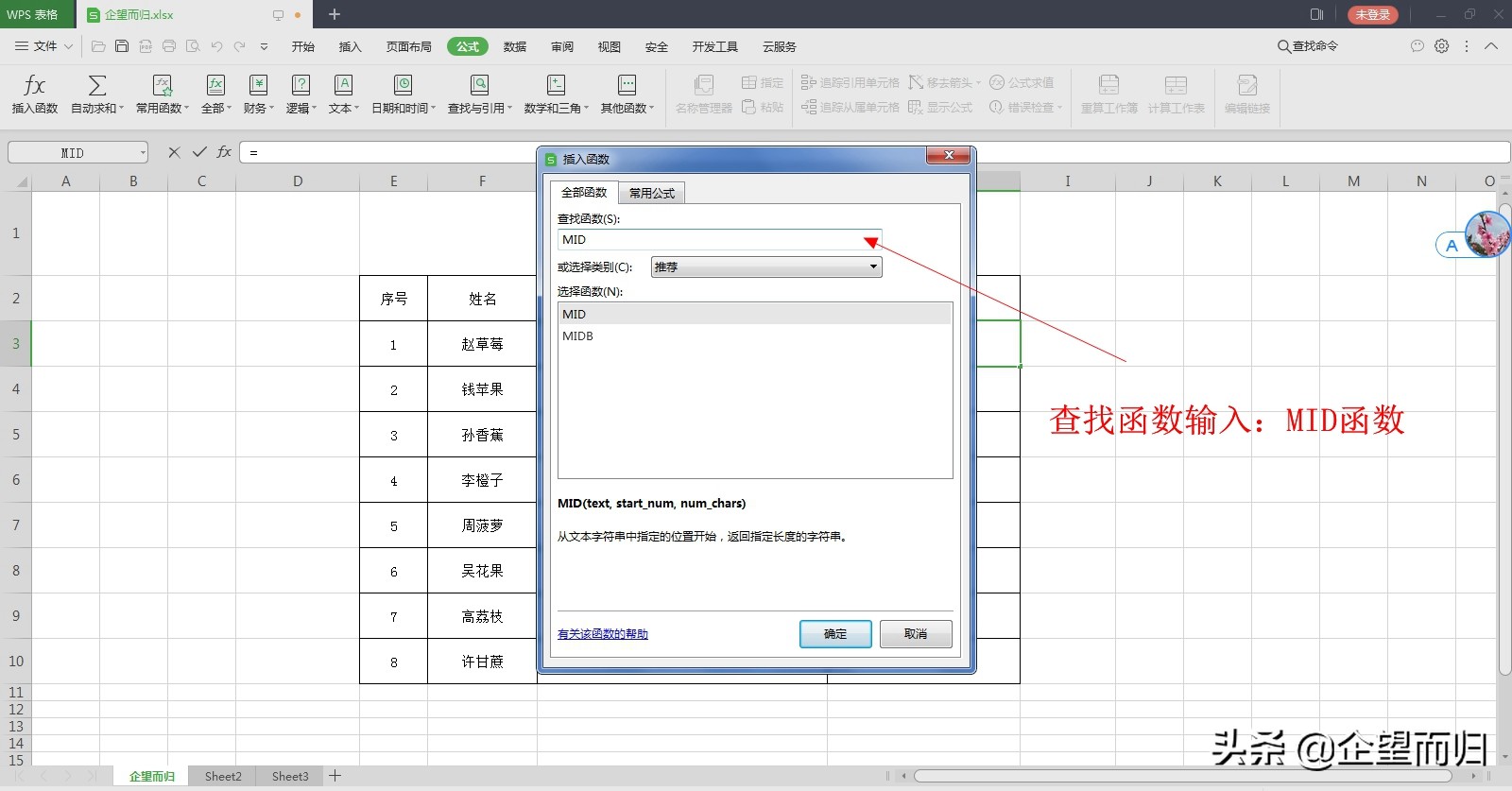打开的对话框中查找函数输入:MID函数